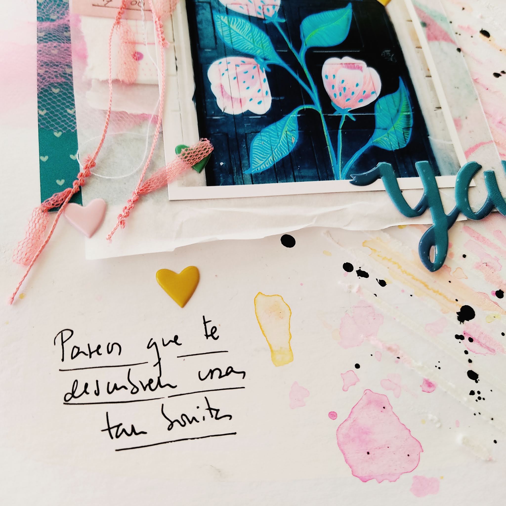 La foto enmarcada con restos de papeles favoritos, que juntos me encantan, sellos, algunos puffy, manchas y voilá, página acabada, espero que te guste tanto como a mí 😊